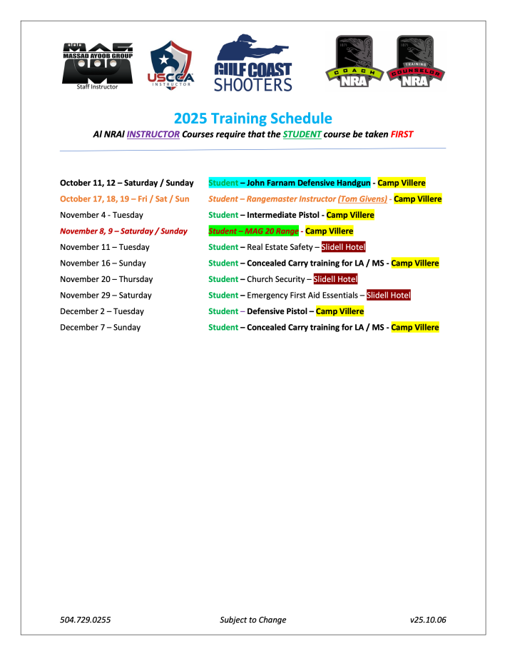 We provide firearms instruction in Louisiana and Mississippi, based in Mandeville, LA and teach primarily at Camp Villere in Slidell, LA. Our owner, a former police firearms instructor, has been providing firearms instruction since 2009 and specializes in providing people across the Gulf Coast with the very best in concealed carry permit and certified NRA training and several other training courses to fit your need.
